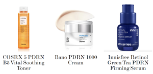 Một số sản phẩm có PDRN đang được bán: COSRX 5 PDRN B5 Vital Soothing Toner, Bano PDRN 1000 Cream, và Innisfree Retinol Green Tea PDRN Firming Serum.